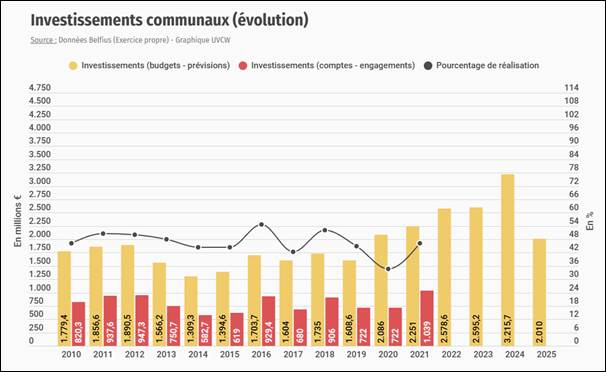 À côté des dépenses ordinaires, il est important de ne pas oublier les dépenses liées au financement des investissements communaux (les dépenses extraordinaires). On notera d’ailleurs à ce propos que les pouvoirs locaux (dont les communes constituent le maillon principal) sont les plus importants investisseurs publics du pays, concentrant à eux seuls environ 40 % des investissements, et constituent donc un levier économique majeur[2].